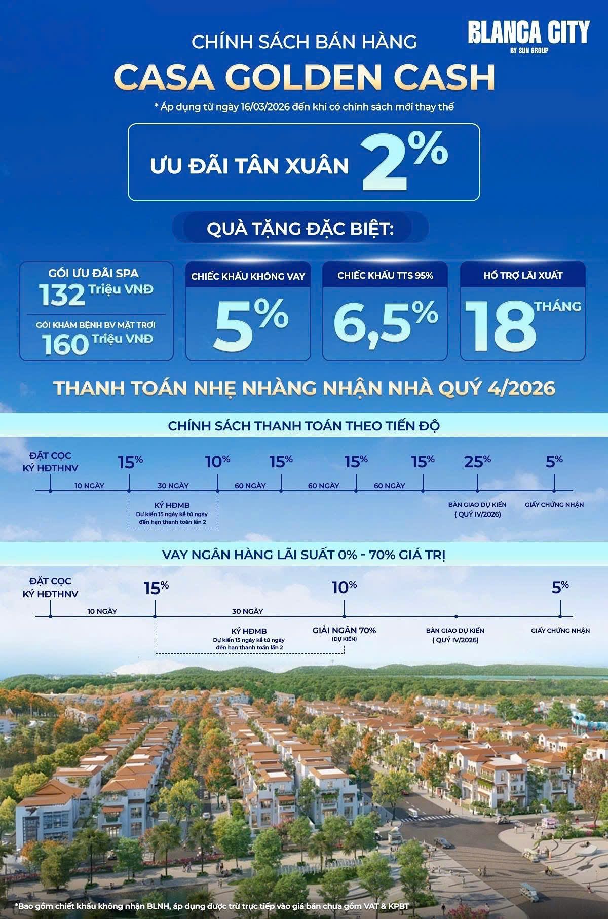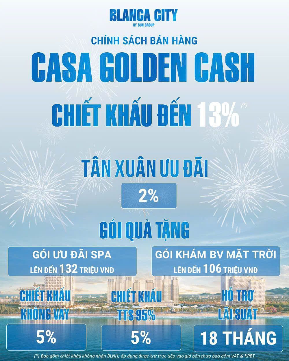 Điểm cộng đắt giá nhất khiến Blanca City trở thành tâm điểm đầu tư chính là chính sách bán hàng "Casa Golden Cash" cực kỳ linh hoạt được áp dụng từ ngày 16/03/2026. Trước hết, đối với những nhà đầu tư ưu tiên sử dụng vốn tự có, chủ đầu tư Sun Group đưa ra mức ưu đãi "kép" cực kỳ hấp dẫn.