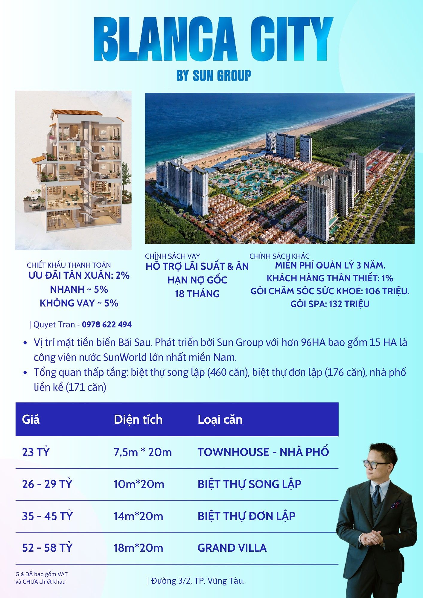 Tọa lạc tại vị trí mặt tiền biển Bãi Sau, Blanca City không chỉ là một biểu tượng nghỉ dưỡng mà còn là "tài sản truyền đời" hiếm hoi có pháp lý sở hữu lâu dài. Với sự xuất hiện của Sun World lớn nhất miền Nam vào tháng 02/2026, dự án đang trở thành tâm điểm thu hút dòng tiền của giới đầu tư toàn quốc. Các anh chị hãy cùng QuyetTran LUX tìm hiểu về dự án ngay trong bài viết dưới đây!