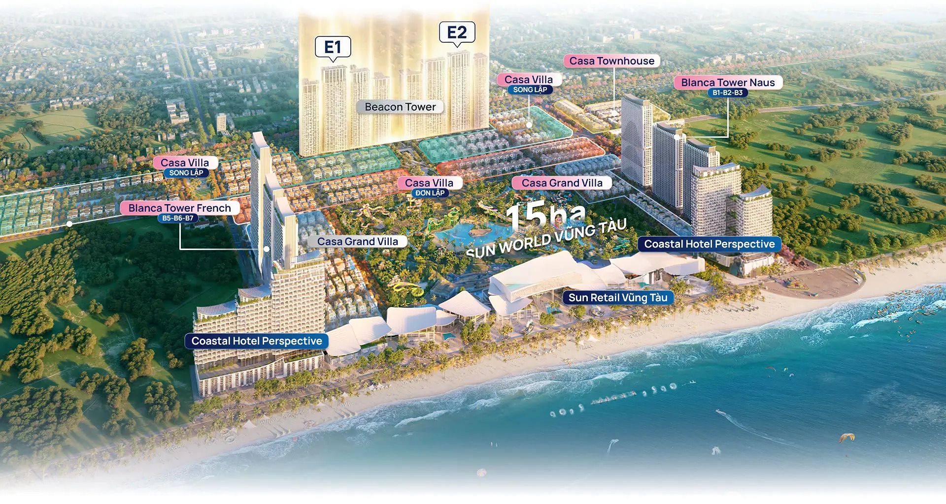 Tâm điểm dự án là 8 tòa tháp Beacon, sừng sững như những ngọn hải đăng, biểu tượng của ánh sáng tri thức và thịnh vượng, gợi nhớ ngọn hải đăng cổ do người Pháp xây dựng năm 1862 tại Vũng Tàu.