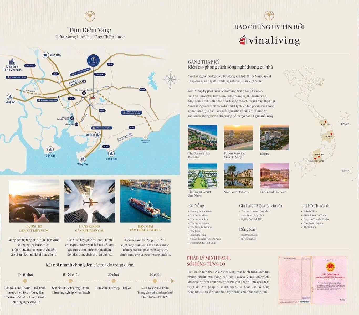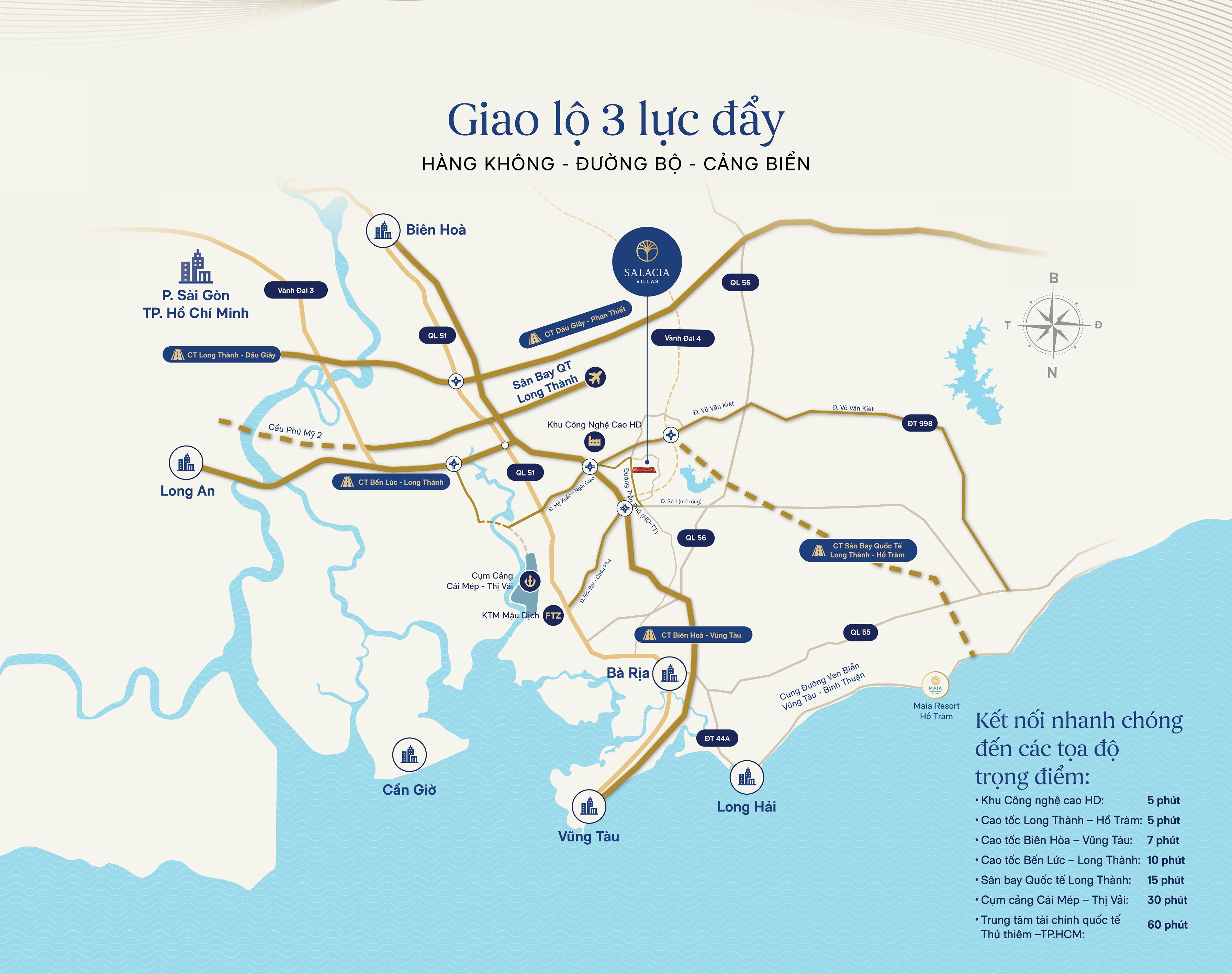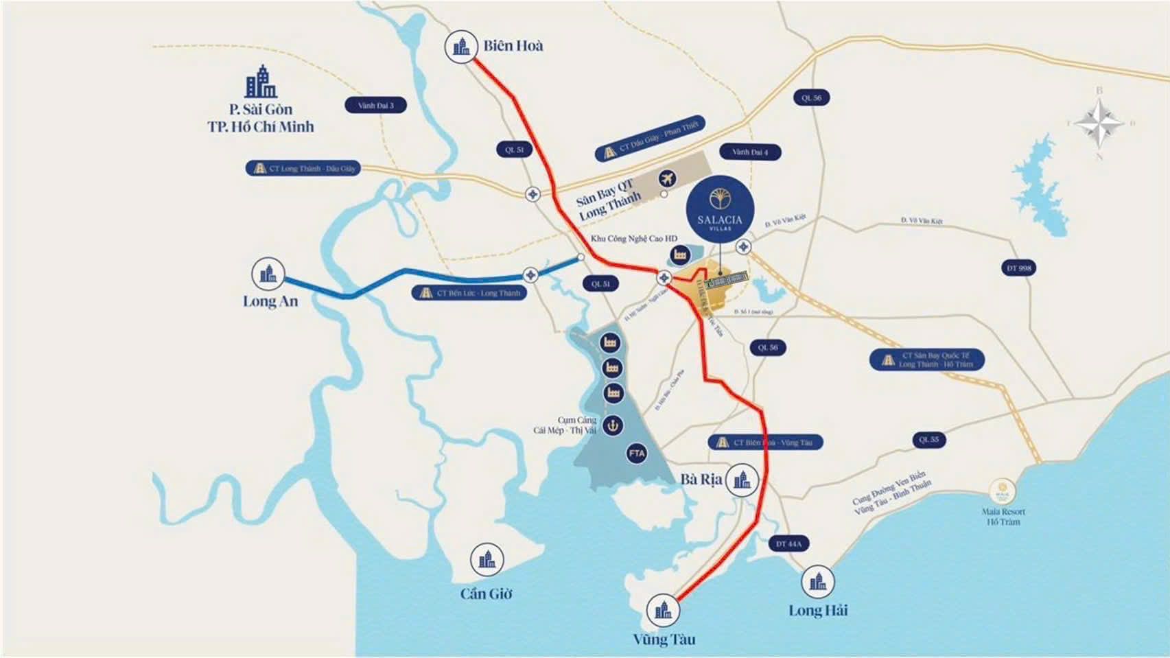 Với khoảng cách chỉ 15 phút đến sân bay Long Thành, 30 phút đến cụm cảng nước sâu Cái Mép – Thị Vải, Salacia Villas sở hữu lợi thế kết nối toàn diện hiếm có.